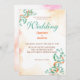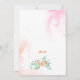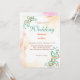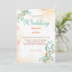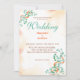 La conception comporte des éclaboussures d'aquarelle orange clair et des éclaboussures simulées. Le design contient également des branches d'eucalyptus et d'autres éléments orange clair dans les tons orange foncé, et plus pour s'adapter à toutes les saisons que votre mariage peut tomber dans et les couleurs qui complètent le blush couleur. Le dos de l'invitation a un beau monogramme de mariée et mariée.