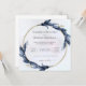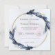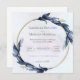 Ce faire-part de mariage sophistiqué est doté d'une bordure circulaire fleurie avec des feuilles bleu foncé, ajoutant une touche d'élégance au design. Le texte central annonce le mariage de Rachelle Beaudry et Morgan Maxwell, invitant les invités à la cérémonie à l’église St. Alaye le samedi 17 août à 16h, suivie d’une réception à l’hôtel L’Esperie. La police serif propre contre un arrière - plan léger donne à l'invitation un charme classique et intemporel.