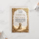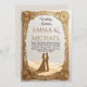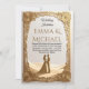 Un luxueux faire-part de mariage avec cadre fleuri doré orné, arrière - plan en ivoire, et élégante silhouette mariée et mariée en or chatoyant. Idéal pour les couples à la recherche d'une élégance intemporelle et d'un style papeterie mariage haut de gamme.