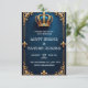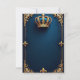 Elégante modèle de style royal avec une couronne dorée finement dessinée, ornée de pierres précieuses au sommet, sertie contre un riche arrière - plan bleu foncé aux textures subtiles évoquant le velours, entourée de motifs ornés d'inspiration château tels que tours, arches, fleur de lis en or, avec une touche de blanc crémeux pour évoquer luxe et raffinement. espace pour des détails mariages personnalisés dans une police serif raffinée avec des contours dorés subtils, et une subtile bordure dorée pour compléter l'apparence royale, parfait pour une célébration mariage majestueuse et opulente.