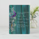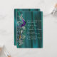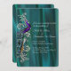 Chic turquoise satin à l'air faire-part de mariage, avec de jolis graphismes d'un ton argenté fleurissent sur le côté gauche avec un paon coloré, au milieu de la décoration florissante. Le texte en gris clair est prêt à être personnalisé pour votre jour de mariage. Produits correspondants disponibles.