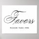 Cette belle et intemporelle signalisation horizontale "Favors : Please Take One" ajoute une élégance simple à toute réception de mariage, douche ou motif de fête classique. Le design de script luxueux comprend une calligraphie noire moderne fantaisiste et romantique. La belle police avec une couleur arrière - plan personnalisable permet de s'adapter facilement à n'importe quel thème. Pour d'autres couleurs ou produits correspondants, veuillez visiter le magasin JustFharryn Zazzle, ou contacter le concepteur, c/o Fharryn@yahoo.com Tous droits réservés. #zazzlemade