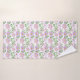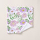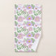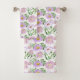 Un ensemble de serviettes de bain fleuries violettes et blanches avec de la verdure d'eucalyptus. Ceux-ci font de beaux cadeaux pour les douches de mariée ou à peu près n'importe quelle autre occasion.