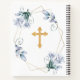Élégant Livre D'Invité Baptême. Design avec cadre doré avec de beaux éléments floraux bleus attachés à lui, croix d'or et livre d'or en lettrage moderne. Le Baptême Parfait garde le saké.