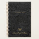 Elegant vintage black floral botanical pattern planner with a custom monogram in gold classic san serif typography and name in gold modern script typography.