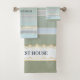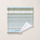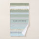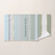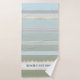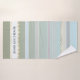Une belle serviette de bain rayée aux couleurs pastel vert bleu et gris de la plage. Les vagues ont un design stylisé or (imprimé). Vous pouvez utiliser les textes à des fins de location si vous le souhaitez, ou toute autre utilisation. Il est également possible de le supprimer si vous n'en avez pas besoin. Belle pour une maison de plage ou un espace de vie côtier ainsi qu'une salle de bain design aux couleurs pastel.