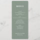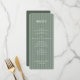 This elegant wedding menu features a vertical layout with alternating shades of green stripes, creating a sophisticated and understated backdrop. The design utilizes clean serif typography for the menu headings and items, ensuring clarity and readability while maintaining an air of formality. Customizable placeholders allow for personalization with names and dates, making it perfect for special occasions. The minimalist aesthetic focuses on typographic hierarchy, conveying a mood of refined elegance ideal for weddings or formal gatherings.