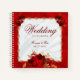 Cet élégant carnet en spirale de mariage budget présente un arrière - plan métallique faux rouge, du satin blanc, et un cadre en or filigree bijoux combinés avec des roses rouges riches, avec un script élégant, et les noms de la mariée et mariée avec la date mariage.