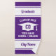 Élégante classe de fin d'études secondaires de 2025 cadeau senior serviette de bain. Idée cadeau de célébration personnalisée pour les étudiants diplômés de niveau supérieur, de niveau collégial et universitaire. Couleurs violettes et blanches avec motif rayé athlétique. Couleurs personnalisables. Logo casquette moderne avec des lettres monogrammes. Ajoutez votre propre nom de diplômé, le nom de l'école, la ville, l'état, l'année, etc.