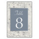 Boho, élégant, moderne, bleu poussiéreux numéro de table de mariage avec dentelle gris argenté doré fleuri.