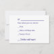Cette carte de réponse mariage présente une jolie bordure argentée ornée d'un coin. Votre texte personnalisé est en argent au centre. Les images et le texte sont placés sur un dégradé bleu royal arrière - plan qui brille presque! Le dos de la carte de réponse est blanc pour que votre répondant puisse facilement marquer, et comprend une zone pour les choix de menu. Tout le texte est personnalisable, et si vous avez besoin d'aide, n'hésitez pas à nous contacter via notre adresse e-mail de magasin. Nous sommes toujours heureux de vous aider ! Cette carte correspond aux Elegant Blue Silver Frame Wedding Invitations dans notre magasin.