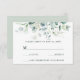 Cette carte RSVP de mariage est composée d'eucalyptus à l'aquarelle peinte, de feuilles vert botanique et bleu clair.