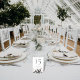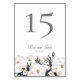 Délicat lit de roses blanches au bas de cette élégante carte de numéro de table de mariage. Typographie grise personnalisable pour le numéro de table, les noms des jeunes mariés et la date de l'événement.