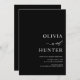 Cette élégante faire-part de mariage tout en un présente une calligraphie moderne et une typographie audacieuse classique. Avec son arrière - plan noir, il est chic et frais. Le verso comporte un code QR où vous pouvez lier votre site Web mariage et les directions rsvp.