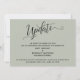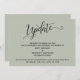 La distinction de cette suite est due à la police de script complexe et tourbillonnante utilisée pour les phrases d'accent. Dans l'éventualité où vous devez informer vos invités que votre mariage a été reporté, cette carte offre une option simple et élégante. Dans cette pièce, la police calligraphie a été utilisée pour créer un graphique représentant le mot "Mise à jour". Utilisez les champs modèles pour ajouter vos données personnelles et faire de cette conception votre propre. L'arrière - plan peut être changé en n'importe quelle couleur. Veuillez communiquer avec toute demande spéciale ou customiser de l'aide. // 98 //