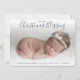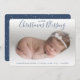 Annoncez la naissance de votre nouveau bébé garçon ou fille avec cette carte photo moderne avec le message "Notre petite bénédiction de Noël" dans une police d'écriture bleue élégante en haut. Ajoutez le nom et les statistiques de naissance de votre bébé en bas. Utilisez le modèle pour ajouter votre propre message personnel à l'arrière.