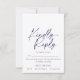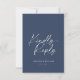 Cette élégante carte RSVP bleu marine présente un design de calligraphie sophistiqué et moderne avec "Kindly Reply" dans un script blanc élégant. Personnalisée avec les noms du couple et la date du mariage, cette carte de réponse d'invitation raffinée est parfaite pour des thèmes mariages formels et intemporels. Une excellente façon de recueillir les réponses des clients tout en ajoutant une touche d'élégance à votre papeterie mariage.
