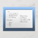 La carte postale parfaite pour la suite de faire-part de mariage en imaginaire bleu. Ces cartes postales permettent d'économiser la nécessité d'une enveloppe supplémentaire. Modifiez la date à l'avant. Changez les entrées de votre choix et ajoutez votre adresse de retour. N'oubliez pas d'ajouter un timbre-poste pour faciliter le retour de vos invités.