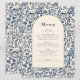 Faites l'apéro de votre réception de mariage avec cet élégant menu botanique, conçu pour compléter une célébration classique et intemporelle. La bordure florale sophistiquée en bleu profond encadre le texte central, offrant une présentation gracieuse et raffinée pour vos invités. Avec un design arrière - plan d'inspiration vintage et crème, vous apportez une touche de charme d'antan à votre célébration moderne. Parfait pour ajouter une couche de beauté supplémentaire à votre table, ce menu guide vos invités à travers les délicieux cours prévus pour votre grand jour. Idéal pour les couples à la recherche d'une esthétique traditionnelle et élégante pour leur mariage.
