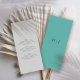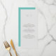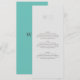 Pour le couple à la recherche de simplicité et de sophistication, notre menu minimaliste mariage est le choix idéal. Conçu pour s’adapter à notre élégante suite mariage minimaliste, cet élégant design conserve un élégant arrière - plan presque blanc-gris, avec les initiales du couple élégamment centrées sur la moitié supérieure, faisant un excellent usage de l’espace négatif. Le menu mariage est soigneusement placé sur la moitié inférieure, tout en conservant un aspect propre et élégant. Au fond du menu, un étonnant arrière - plan turquoise avec les initiales du couple, imprimées avec goût au centre. Ce design est idéal pour ceux qui apprécient l'élégance sobre et le minimalisme moderne.