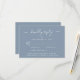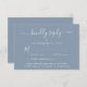 Elégante carte RSVP de mariage bleu poussiéreux avec "rsvp" dans un script blanc élégant avec des swashes, typographie blanche simple et moderne, menu personnalisé options d'entrée et vos noms réunis par un coeur sur le dos.