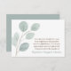 Simple et élégant, ce design floral élégant est le moyen parfait d'envoyer votre plus grande gratitude aux amis et à la famille qui ont honoré un membre de la famille qui est récemment passé. La conception comprend des branches d'eucalyptus à l'aquarelle peinte à la main, une bordure correspondante et un texte personnalisable pour répondre à vos besoins de célébration mariage. Un grand design pour n'importe quelle union de deux personnes. L'arrière comporte un texte vert et blanc souple assorti qui peut être modifié pour s'adapter au texte supplémentaire ou supprimé selon les besoins.