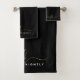 Ensemble de serviettes personnalisées (ou pièces individuelles) avec des initiales de calligraphie manuscrites simples et élégantes ou monogramme et nom en or et blanc contre un arrière - plan noir modifiable pour un look élégant. MODIFICATIONS : Modifiez la couleur de l'arrière - plan, choisissez un arrière - plan graphique stylisé ou modifiez le style, la couleur, la taille et le placement de la police de texte en cliquant sur MODIFIER dans la section PERSONNALISER pour une conception personnalisée. ASSISTANCE : Pour obtenir de l'aide sur la modification ou la personnalisation de la conception, le changement de couleur, le redimensionnement ou le transfert de la conception à un autre produit, contactez le concepteur AVANT DE COMMANDER via l'onglet MESSAGE Conversation Zazzle ci-dessous ou envoyez un courriel à makeitaboutyoustore@gmail.com.