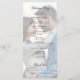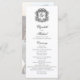 Cet élégant programme de mariage en noir et blanc présente une crête ornée au sommet avec les initiales monographiques de la mariée et du marié en caractères de script formels fantaisie, et une photo du couple heureux au dos du texte de la fête de mariage.