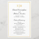 Élégant programme de mariage avec votre monogramme et une bordure en faux or entourant vos détails. Vos noms et en-têtes sont en calligraphie. Le front a votre ordre de cérémonie et le dos a votre fête de mariage et message de remerciement. Ces programmes de mariage simples et classiques sont parfaits pour un mariage formel et sont imprimés sur des feuilles de papier pour une option économique et économique.