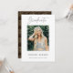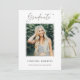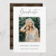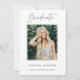 Carte de faire-part de remise de diplômes élégante avec la photo du diplômé avec "Graduate" en écriture moderne. Personnalisez la photo en ajoutant le nom du diplômé, le nom de l'école et l'année de remise des diplômes. L'envers comporte un abstrait motif en cercle doré sur un arrière - plan marron. Vous pouvez customiser la couleur arrière - plan inverse.