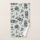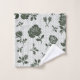 Deux serviettes à motifs sont présentées avec un design floral. L'image du haut montre une serviette suspendue à une tringle, tandis que celle du bas montre un gant de toilette avec un coin retourné.