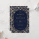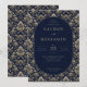This elegant wedding invitation features a sophisticated design with an oval-shaped central panel set against a richly patterned background. The color palette includes deep navy blue and cream, creating a luxurious atmosphere. Intricate floral motifs frame the panel, enhancing the classic and formal style. The typography is prominent, with customizable placeholders for names, dates, and locations, ensuring personalization while maintaining readability and visual harmony. Perfect for couples seeking a timeless and refined aesthetic for their special day.