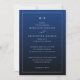 This elegant wedding invitation features a deep navy blue background with a clean, centered layout that exudes sophistication. The design utilizes classic serif fonts in varying weights to create a visual hierarchy, ensuring all essential details stand out clearly. With customizable placeholders for names, dates, and locations, it offers flexibility while maintaining a formal and traditional aesthetic. Perfect for couples seeking a minimalist yet refined look, this invitation sets the tone for a memorable celebration.
