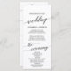 Cet élégant programme de mariage noir après cérémonie est parfait pour un mariage simple. Le design neutre présente une carte minimaliste décorée de typographie romantique et fantaisiste. Inclure le nom de la mariée et du marié, la date et le lieu du mariage, le message de remerciement, l'ordre de service, les informations sur l'heure du cocktail et la fête de la mariée.
