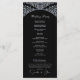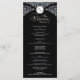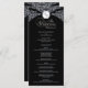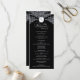 Ce programme de mariage comporte un arrière - plan noir audacieux encadré de fleurs damassées blanches et ornées, lui donnant un style formel et intemporel. En haut, une crête décorative affiche les initiales, tandis que le centre du design présente les noms du couple et tous les détails du service mariage dans un agencement propre et organisé. Le contraste entre le noir et le blanc crée un look saisissant qui met l'accent sur l'élégance et le raffinement, ce qui en fait un choix parfait pour les mariages traditionnels ou en soirée.