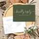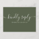 Une élégante carte de script signature RSVP avec typographie chic sur un arrière - plan vert olive. L'inverse vous donne vos détails et une demande amusante de chant invité. Conçu par Thisisnotme©