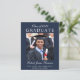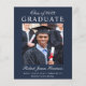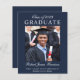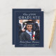 Faire-part de graduation bleu foncé, simple et élégant et abordable, avec une photo du diplômé, son nom et son année de classe dans un script blanc et son école, majeure et honneurs dans la typographie blanche moderne.