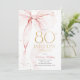 Elegant pink bow 80th birthday invitation. Feminine design in blush pink and gold. Features trendy watercolor coquette bow, and modern typography font. Perfect for an elegant style women's bday celebration. Personalize with your own details. Printed Zazzle invitations or instant download digital printable template.