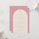 This wedding invitation features an elegant, vertically oriented layout with a soft pink background and a central cream-colored arch framing the text. The design utilizes classic serif fonts in varying sizes to create a harmonious flow, emphasizing key details like the couple's names and event date. Its minimalist approach focuses on typography and simple geometric shapes, conveying a mood of refinement and celebration suitable for a formal occasion. The muted color palette enhances the sophisticated aesthetic, making it perfect for couples seeking a timeless and graceful invitation design.