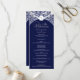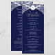 Cette carte de programme de mariage présente un arrière - plan bleu foncé surligné d'argent orné pour une apparence raffinée et formelle. Une crête en haut encadre élégamment les initiales du monogramme, tandis que la section centrale présente les noms du couple et les détails complets du service mariage dans un format propre et organisé. L'association de bleu riche et d'argent chatoyant crée un design intemporel et sophistiqué, parfait pour les mariages du soir et les célébrations classiques.