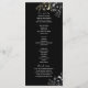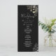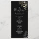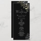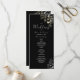 Vintage, élégant, boho, programme de mariage noir chic, avec dorures argentées et dentelle dorée fleurie.