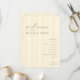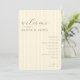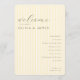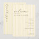 Ce programme de mariage élégant présente un design minimaliste avec un fond beige clair et des rayures diagonales subtiles. La mise en page est structurée verticalement, mettant en avant le mot "welcome" dans une écriture cursive élégante en haut, suivi des noms du couple en majuscules grasses. Une police sans-serif épurée liste le programme de la cérémonie sur le côté droit, offrant clarté et organisation. La palette de couleurs neutres crée une atmosphère calme et accueillante, parfaite pour un événement formel. Idéal pour les couples recherchant une sophistication discrète, ce programme combine la simplicité avec une typographie raffinée pour donner le ton de leur journée spéciale.