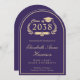 Faire-part de diplôme universitaire violet en forme d'arc avec "Classe de" en or illustration d'une couronne de laurier, d'un casquette et d'un diplôme en or, et le nom du diplômé dans un élégant script en or. Ajoutez leur école, major, distinctions honorifiques ou plans d'avenir dans la typographie classique de la serif d'or.