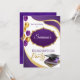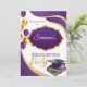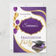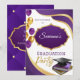 Célébrez la grande journée de votre diplômé en style avec cette élégante invitation à la fête de graduation violet et or! Avec un design royal avec des ballons dorés et violets brillants, des courbes luxueuses et une casquette de graduation classique sur une pile de livres, cette invitation est parfaite pour honorer la réussite de votre diplômé. La présentation attrayante comprend un cadre personnalisable pour les détails de votre événement, ce qui facilite la personnalisation pour le lycée, l'université, ou toute célébration de graduation. Idéal pour l'envoi postal ou les invitations numériques !
