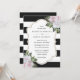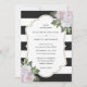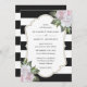 Invitation vos invités à votre élégante fête de mariage noir et blanc avec ces invitations de mariage rose fleuri avec des fleurs roses et verdure sur un arrière - plan rayé noir et blanc.