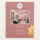 Élégant rose Ajouter Logo Texte Personnalisé Photo Business Planner. Insérez votre logo et votre photo d'entreprise et customisez le texte, le nom de l'entreprise, l'adresse et les coordonnées. Planificateur de promotion et de marketing pour vos clients et partenaires commerciaux. Le design a un arrière - plan rose foncé avec un feuillage doré élégant dans le coin. Le design est parfait pour une petite entreprise de beauté.