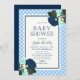 Elégante invitation au Baby shower floral avec des roses bleus, des fleurs de menthe et de jaune, et des feuilles verts avec un centre blanc off et des bordures bleues contre un bébé bleu en vichy arrière - plan sur le devant. L'invitation a un côté bleu arrière. C'est une invitation parfaite pour un baby shower garçon. Consultez d'autres éléments de baby shower ici https://www.zazzle.com/rosewoodandcitrus/gifts?cg=196748758771183969?rf=238364477188679314 Personnalisez cette invitation avec vos détails en remplaçant le texte de l'espace réservé. Pour plus d'options comme changer la police, la taille du texte/la couleur, l'espacement entre les lettres ou pour contracter ou développer le texte courbe cliquez sur le bouton "Personnaliser". *Veuillez noter que le filigrane Zazzle qui apparaît dans l'aperçu du zoom n'apparaîtra PAS sur le produit imprimé final. © Bois de rose et agrumes