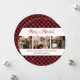Elégante photo plaid rouge jeunes mariés cartes de Noël avec un arrière - plan plaid noir et rouge boule enneigé avec 3 photos au milieu et un beau titre de script écrit à la main ci-dessus. Personnalisez facilement cette carte de Noël rouge et mariée avec vos images, votre texte et votre nom de famille.