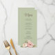 Elegant wedding menu featuring watercolor blush and ivory peonies with greenery on a soft sage green background. A perfect choice for garden, outdoor, or romantic wedding receptions. Personalize the text to fit your wedding meal details.