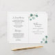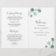 Élégant programme de mariage à budget plié avec un design simple avec aquarelle peinte sauge vert eucalyptus verdure dans le coin supérieur gauche et le coin inférieur droit. Ces programmes de mariage botanique rustique avec une touche moderne sont parfaits pour un mariage de printemps ou d'été.